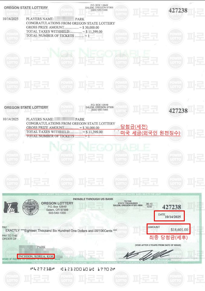 미국을 직접 방문하시지 않고 파로코 회원 명의로 당첨금 클레임을 대리 신청하였습니다.